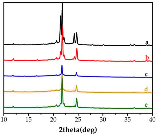 The crystallization property was characterized by X-ray Diffraction (XRD). As shown in curve a of Figure 4, typical diffraction peaks of 1-HD were observed at angles of 2θ = 20.6°, 21.4°, 21.8°, 22.1°, 24.2°, 24.7°, which corresponded to the TC-PCMs. In curves c–e, the peaks at 21.4° and 24.2° weakened—probably due to the doping of dyes. In curve b, the diffraction peaks were nearly unchanged, indicating that the doping dose of TC-PCM180 had no significant influence on the crystallinity of 1-HD.