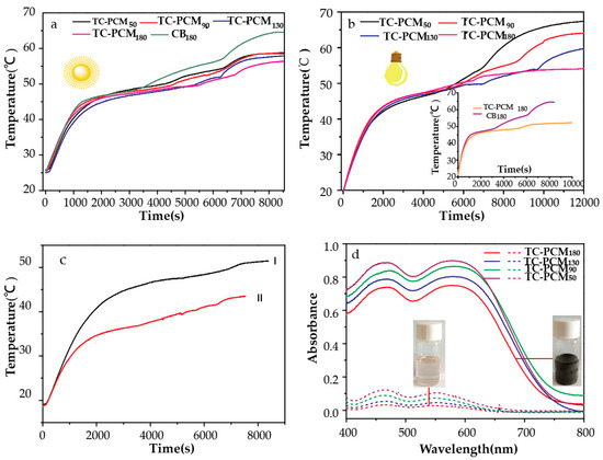 (a) Photo-thermal conversion curves under solar radiation (b) Photo-thermal conversion curves under simulative light (c) Photo-thermal conversion curves of 1-hexadecanol (І) and 1-tetradecanol (Ⅱ) as PCMs (d) visible light absorption of TC-PCMs under liquid and solid state.