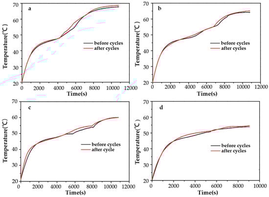Photo-thermal conversion before and after 20 times irradiation and cooling cycles of (a) TC-PCM50 (b) TC-PCM90 (c) TC-PCM130 (d) TC-PCM180.