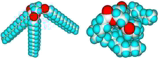 Energy-minimized forms of tristearin (graphics by ChemBrain IXL). (Left) stearyl chains stretched, Vm = 997.6 A3; (right) stearyl chains randomly folded, Vm = 992.9 A3.