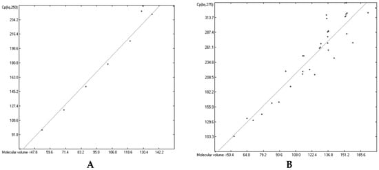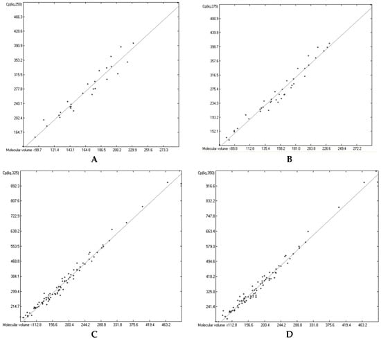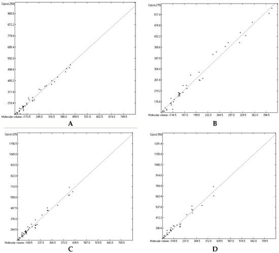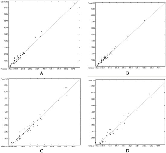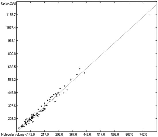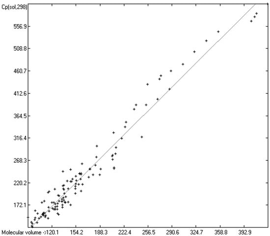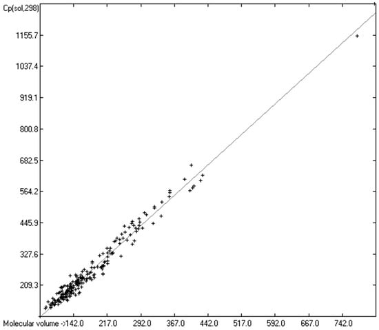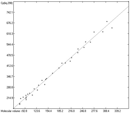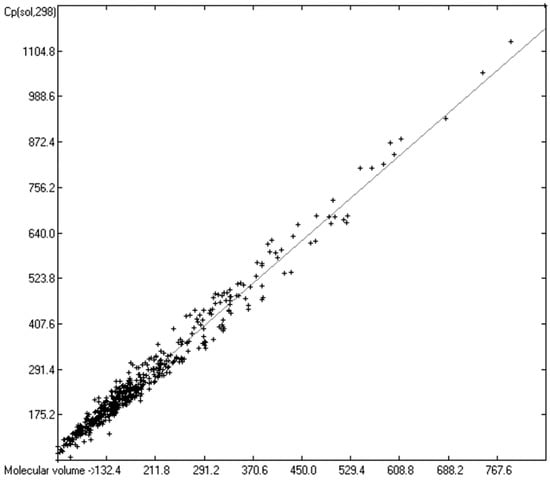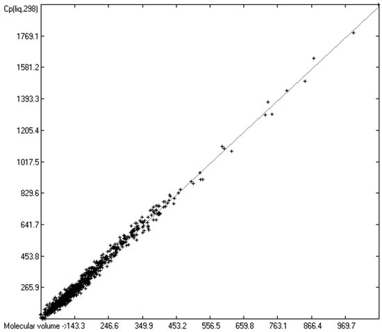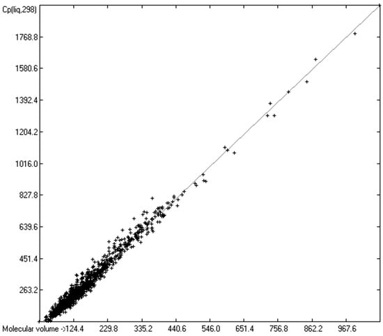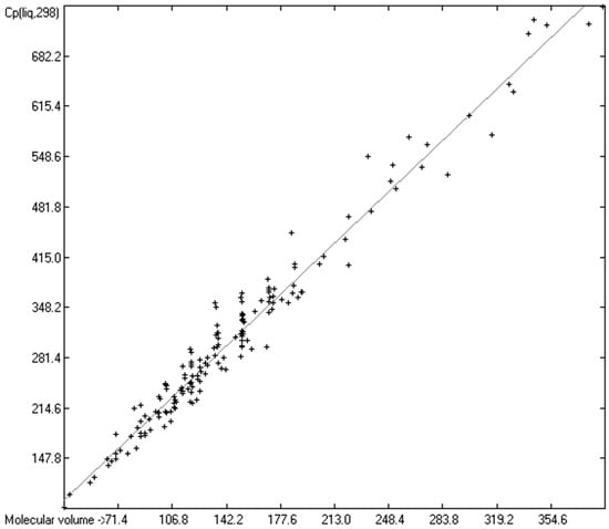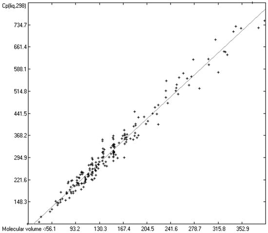 As mentioned in the introductory section, the VBT approach of Gardas et al. [11] and Glasser and Jenkins [28] pointed to a possible way to overcome the GA models’ disadvantage of not being globally applicable. Since ChemBrain’s database enables the search for correlations between any two molecular descriptors, it was obvious to try to find one—in accordance with the VBT approach—between the heat capacities and the “true” molecular volume, calculated as described in Section 3.2. The correlation between the “true” molecular volume and the experimentally measured liquid heat capacity of 1303 compounds of all classes indeed revealed a surprisingly good linearity over a large volume range, as shown in Figure 2, with a correlation coefficient of 0.9785 after removal of the worst outliers, despite a fairly large standard error of ca. 28 J/mol/K and a mean absolute percentage deviation (MAPD) of 8.23%.