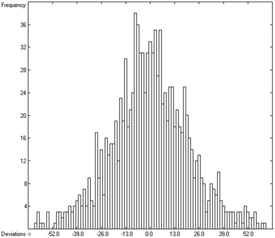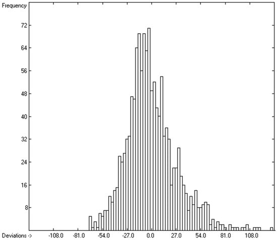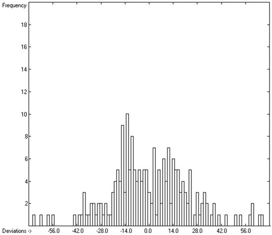 The intermolecular hydrogen-bridge effect found in alcohols and acids evidently required a separation of these molecules from those without this effect in the heat-capacity prediction. This task was easily achieved by a simple algorithm which scanned each molecule for the first single bond having an oxygen atom at one end and a hydrogen atom at the other and, if found, skipped it. The exclusion of these molecules from the list of liquids yielded a distinctly better compliance with the experimental data as is demonstrated in the correlation diagram (Figure 4). The corresponding histogram (Figure 5) also shows a more symmetrical deviation distribution about the zero point. The good accordance of the experimental with the calculated Cp(liq.298) values, with a correlation coefficient R2 of 0.9890 and a MAPD of 6.51% based on a large variety of chemical structures within the 1102 compounds, allows great confidence in Equation (2), which translates the “true” volume Vm of a molecule free of hydroxy groups into its liquid heat capacity at 298.15 K.