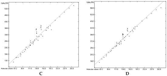 A weaker trend of this kind can be found when comparing linear with branched alkanes of the same chemical formula in that the branched species have systematically and significantly lower experimental heat capacities than their linear relatives, although their molecular volumes are all of nearly equal size, and thus Equation (2) would suggest very similar Cp values. Some examples of the differences of deviation may be given: pentane: −0.01% vs. 2,2-dimethylpropane (neopentane): −9.01%; heptane: −1.10% vs. 3,3-dimethylpentane: −5.40%. Hence, it seems that branching also lowers the number of effective rotational and possibly vibrational degrees of freedom. Nevertheless, these prediction errors rarely exceed the methods’ standard deviation but should be kept in mind when applying Equation (2).