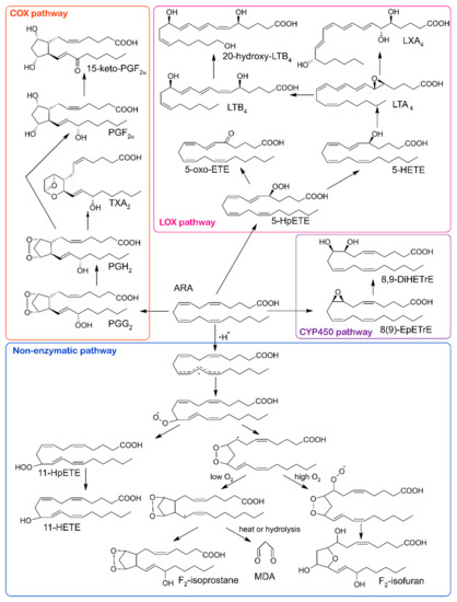 Eicosanoids formed from ARA are the most prevalent compounds in the oxylipin family [1]. ARA is a component of membrane phospholipids. It can be released by the phospholipase A2, as well as formed from diacylglycerol by diacylglycerol lipase [8]. ARA can be metabolized to hydroxyeicosatetraenoic acids (HETEs), dihydroxyeicosatetraenoic acids (DiHETEs), epoxyeicosatrienoic acids (EETs), prostaglandins (PGs) and thromboxane (TX), see Figure 1.