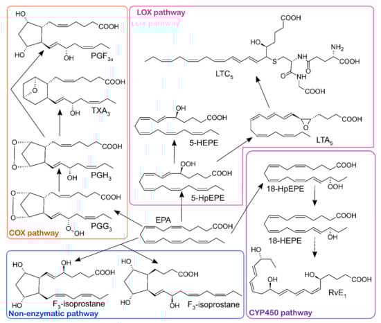 EPA is a precursor of well-known eicosanoids, such as the PG 3-series and TXs (COX) and 5-series leukotrienes (LTs) (LOX) [9], as shown in Figure 2.