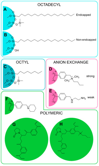 Examples of the most commonly used types of solid-phase extraction (SPE) phases for oxylipin extraction. A: Strata C18-E; B: Chromabond C18; C: Discovery DSC-8; D: Strata-X-A; E: Strata-X-AW; F: Strata-X; G: Oasis HLB; H: Oasis MAX.