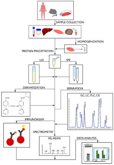 Presently, there are many methods for measuring the levels of oxylipins in human biological samples. However, they all have certain limitations. This is primarily due to the fact that oxylipins are present in extremely low concentrations in biological matrices, have limited stability and are subject to degradation and auto-oxidation [65]. In addition, many oxylipins, especially those derived from the same original fatty acid, have very similar structures [80]. Therefore, their analysis requires rapid, highly-sensitive and accurate analytical methods [112,174], see Figure 4.