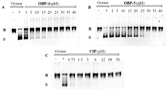 Inhibition assay of OBP-4 (A), OBP-5 (B) and CIP (C) on DNA gyrase. Line 1(−): no compound and DNA gyrase; Line 2(+): DNA gyrase present and compound absent; Line 3-11(9): DNA gyrase with different concentrations of tested compound. R: relaxed DNA; S: supercoiled DNA.