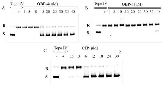Inhibition assay of OBP-4 (A), OBP-5 (B) and CIP (C) on Topo IV. Line 1(−): no compound and Topo IV; Line 2(+): Topo IV present and compound absent; Line 3-11(9): Topo IV with different concentrations of tested compound. R: relaxed DNA; S: supercoiled DNA.