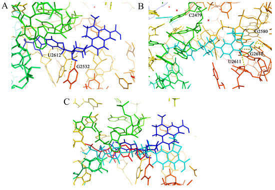 As shown in Table 5, OBP-4 and OBP-5 displayed a strong inhibition action in protein synthesis. To understand the binding mode of OBP-4 and OBP-5, the molecular docking was performed between OBP-4 (or OBP-5) and the active site of 50S subunit. The optimal docking conformations of tested compounds in the active site of 50S subunit were presented in Figure 3. The blue, light blue and red sticks represented the optimal conformations of OBP-4 (Figure 3A), OBP-5 (Figure 3B) and LZD (Figure 3C). As expected, both OBP-4 and OBP-5 can bind to the active site of the 50S subunit. OBP-4 were docked into the active site of 50S subunit, with its oxazolidinone part forming hydrogen bonds with U-2612 and G-2532 (Figure 3A), while OBP-5 were surrounded by G-2580, G-2610, U-2611 and C-2479 (Figure 3B). Furthermore, OBP-4, OBP-5 and LZD have a similarity in the optimal conformations and binding modes to the active site of 50S subunit (Figure 3C). This similarity could explain why OBP-4 and OBP-5 have an oxazolidinone-like antibacterial spectrum and a strong inhibitory activity on protein synthesis. Meanwhile, the better antibacterial activities of OBP-4 and OBP-5 than that of LZD may be attributed to the interactions between fluoroquinolone pharmacophores and the 50S subunit. The further investigations are required to clearly elucidate the mode of action of OBP-4 and OBP-5.