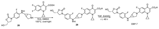 The synthesis of oxazolidinone-fluoroquinolone hybrids OBP-(1–7) was performed as outlined in Scheme 1, Scheme 2, Scheme 3, Scheme 4, Scheme 5, Scheme 6 and Scheme 7. The hybrids OBP-(1–5) consisted of two parts, compound 8 and corresponding acids (Scheme 2, Scheme 3, Scheme 4 and Scheme 5). Compound 8 was synthesized according to the following Scheme 1. The corresponding acids of OBP-1 and OBP-2 were obtained from commercial sources, and those of OBP-(3–5) were synthesized by another routes (Scheme 3, Scheme 4 and Scheme 5). Meanwhile, we also prepared hybrids OBP-6 and OBP-7, containing an exo-3-methyl-6-amino-3-azabicyclo [3.1.0] hexane linker between the oxazolidinone and fluoroquinolone elements (Scheme 6 and Scheme 7). The structures of the target hybrids OBP-(1–7) were further characterized (Supplementary Materials).