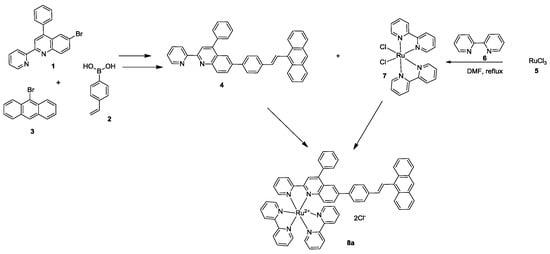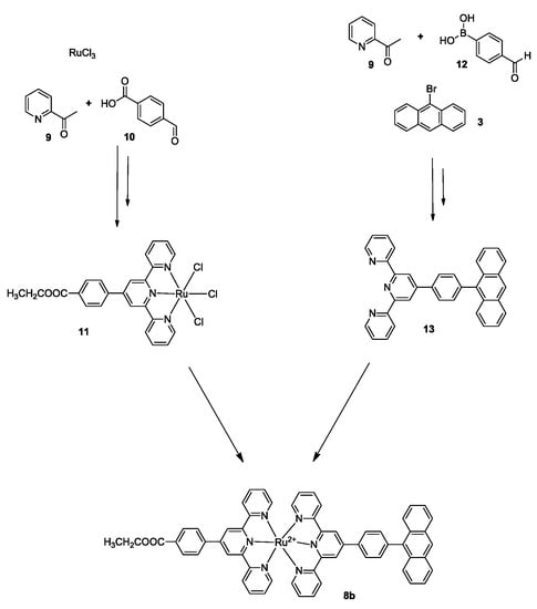 For the synthesis of 8b, acetyl pyridine 9 reacted with acid 10 and RuCl3 furnishing compound 11 (Scheme 3). In parallel, acetyl pyridine 9 reacted with boronic acid 12 and the bromoanthracene 3 afforded compound 13. Finally, complex 13 reacted with complex 11, in the presence of N-methylmorpholine, leading to the final complex 8b in 85% yield (Scheme 3) [35,38].