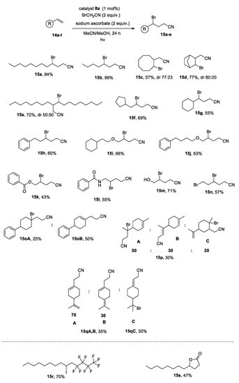 In a similar manner, we also studied the reaction between bromotrichloromethane and aliphatic olefins (Scheme 5). The reaction conditions employed were adopted from the literature [40]. Using these conditions, we tested a number of substrates (Scheme 5). When 1-decene was employed, the targeted product was obtained in excellent yield (Scheme 5, 16a). A more challenging disubstituted alkene, cyclooctene, was tested and proved to be a competent substrate, affording the desired product in good yield (Scheme 5, 16e). Olefins bearing different functional groups were also studied and gave the corresponding products in very good yields (Scheme 5, 16b–d, 16f, 16g).