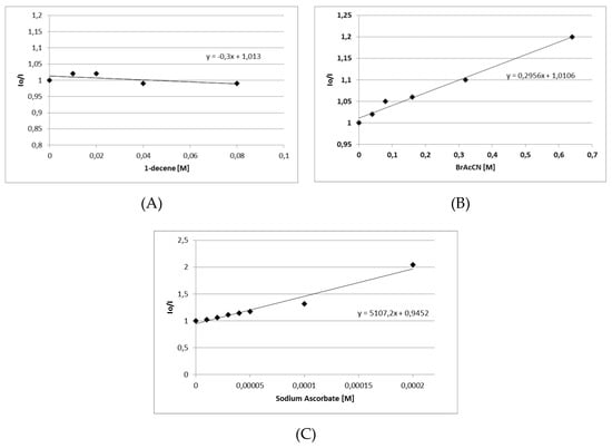 To shed light on the mechanism of these transformations, a series of phosphorescence quenching studies were carried out (Scheme 6). Regarding the reaction with bromoacetonitrile, after irradiation of the photocatalyst at 370 nm, its phosphorescence was measured at 516 nm. Upon increasing the amount of the added 1-decene, no changes in the phosphorescence were observed (Scheme 6A). Increasing the amount of the added bromoacetonitrile, a constant decrease in the phosphorescence was observed (Scheme 6B). Finally, increasing the amount of the added sodium ascorbate, a constant decrease in the phosphorescence was also observed (Scheme 6C). From these data, we conclude that sodium ascorbate is important for the success of the reaction and is a better quencher than bromoacetonitrile.