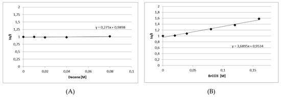 Regarding the reaction with bromotrichloromethane, the same phosphorescence quenching experiments were carried out (Scheme 7). After irradiation of 8a at 370 nm, its phosphorescence was measured 516 nm. When the amount of the added 1-decene was increased, no change in phosphorescence was observed (Scheme 7A). Increasing the amount of the added bromotrichloromethane, a constant decrease in the phosphorescence was observed (Scheme 7B).