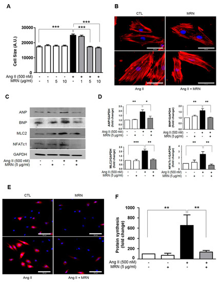 2.1. MRN Attenuated Ang II-Induced Cardiomyocyte Hypertrophy