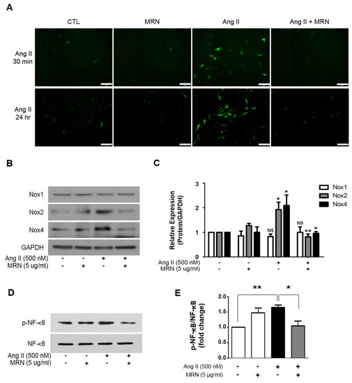 2.2. MRN Inhibited Intracellular ROS Levels in Ang II-Induced Cardiomyocyte Hypertrophy