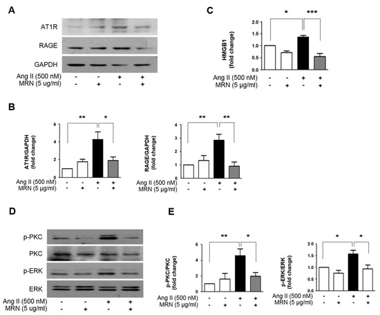 - Lim, S.; Lee, M.E.; Jeong, J.; Lee, J.; Cho, S.; Seo, M.; Park, S. sRAGE attenuates angiotensin II-induced cardiomyocyte hypertrophy by inhibiting RAGE-NFkappaB-NLRP3 activation. Inflamm. Res. 2018, 67, 691–701. [Google Scholar] [CrossRef]