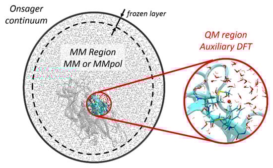 We follow an additive formalism to express the potential energy. The total QM/MM energy () is given by Equation (1). It is the sum of three terms, namely the energy of the QM region (), the energy of the MM region () and the interaction energy between the QM and MM regions (). is calculated within the framework of Kohn–Sham density functional theory (DFT) [16].