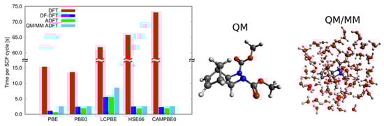 In deMon2k, the QM/MM hybrid ADFT algorithm is implemented for global [53] and range-separated [54] hybrid functionals. For a more extended review of ADFT we refer interested readers to Reference [55]. Figure 2 compares SCF timings for the depicted QM system from a four-center ERI Kohn–Sham implementation [12] with corresponding three-center ERI ADFT timings for the generalized gradient approximation PBE [56], the global hybrid PBE0 [57], the long-range corrected PBE0 [58], the short-range corrected HSE06 [59] and the Coulomb-attenuating PBE0 functional [60]. All calculations were performed in parallel employing 12 Xeon X5675@3.07 GHz compute cores. As Figure 2 shows, the density fitting DFT (DF-DFT) and ADFT SCF timings are usually 1 to 2 orders of magnitude smaller than their four-center ERI counterparts. We also show QM/MM ADFT SCF timings (light blue bars) for the same system embedded in 100 MM water molecules. The comparison between QM ADFT and QM/MM ADFT SCF timings shows that the MM overhead is usually only a small fraction of the QM ADFT timings. For a more extended review of ADFT we refer the interested reader to Reference [55].