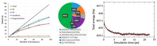 Computational performances for QM/MM Born–Oppenheimer molecular dynamics (BOMD) simulation. Left: speed-up as a function of number of processors. Only tasks representing more than 15% of total execution time are depicted. Middle: pie chart illustrating the most computationally demanding task (taking the job run on 48 processors). Right: energy conservation for in the microcanonical simulations.