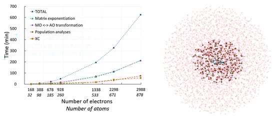Overall our implementation of RT-TD-ADFT in deMon2k either in the gas phase or in the QM/MM and QM/MMpol framework is particularly efficient as it takes full advantage of the advanced algorithms described in Section 2.2. Figure 4 depicts a graph illustrating the performances of RT-TD-ADFT simulations. The system is the same as in Figure 3. We have relied on a DZVP-GGA/GEN-A2*(P, C, N)/GEN-A2(H, O) combination of atomic orbital and auxiliary basis sets, with grids of high accuracy to evaluate XC contributions and to extract atomic charges on-the-fly (every 5 as). An integration time step of 1 as has been used. We vary the size of the QM region by progressive inclusion of hydration layers as QM molecules. Our current implementation enables electron dynamics simulations for molecular systems including up one thousand of QM atoms in reasonable time. For the most demanding case of Figure 4 (878 atoms, 2988 electrons), it takes around 4 days to run 1 fs of simulation, and only 8 h for the systems comprised on 260 atoms. There is still room to further improve computational efficiency of RT-TD-ADFT with deMon2k and progresses are underway in our laboratories.