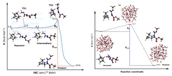 Experimental groups shown that several uni- and bi-molecular reactions are accelerated when performed in aqueous suspensions which are vigorously stirred. This procedure developed by Sharpless and co-workers is known as the “on water” protocol [75]. These type of reactions include different important classes of reactions known as cycloadditions, ene reactions, Claisen reactions and nucleophilic substitutions. Although before the work developed by Sharpless et al. there was already some evidence that many organic reactions are faster in water than in other organic solvents, it has been clarified only later that efficient reactions in aqueous organic chemistry do not require soluble reactants, as it was previously thought [76]. In the “on water” protocol reactions, the used reactants are initially floating on the surface of water, from where the “on water” designation comes from. The mixtures obtained are then stirred vigorously, dispersing the reactants as small droplets. The reaction products are often produced in a pure state under or on the water. These can be than isolated by phase separation of filtration techniques. In between several others fast reactions “on water”, it has been reported that the reaction of quadricyclane with dimethyl azodicarboxylate “on water” protocol amazingly runs to completion in only 10 min, much faster than with other procedures. However, the mechanism of why this reaction in water is so fast remains totally unclear [75,76]. Therefore, in the following example we will try to elucidate this mechanism of the reaction shown in Figure 5 by studying it in the gas phase and in water and compare the obtained potential energy barrier (Eb) in both cases.