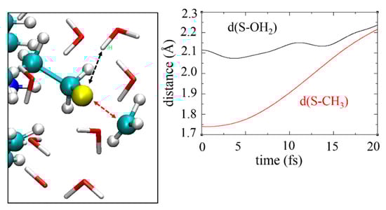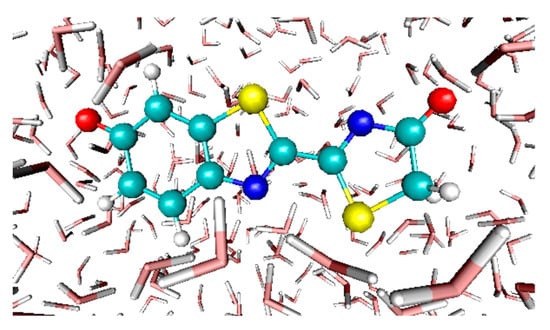 Exchange-correlation effects are included within a hybrid functional proposed by Adamo and Barone [56,85] (PBE0). Local contributions were numerically integrated on a fine grid. The QM atoms were described with an all-electron double zeta valence plus polarization basis set optimized for GGA functionals (DZVP-GGA) [86]. For all calculations, the GEN-A2* auxiliary function set, which contains s, p, d, f and g auxiliary functions that are grouped together into sets with common exponents was employed. For the QM/MM level of theory, the QM part was as the methodology described above, whereas for the MM part, the empirical potential for 100 water molecules, with which the liquid environment was created, was a simple point-charge (SPC) model [87] employing the OPLS-AA Force Field [33].