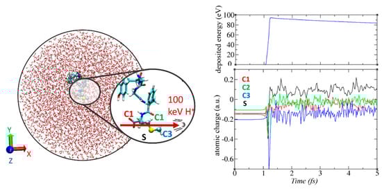 deMon2k implements a module to conduct attosecond electron dynamics simulations under the frozen nuclei approximation via the so-called real-time time-dependent ADFT (RT-TD-ADFT) [24]. This methodology is useful to investigate the response of the electron cloud of a molecular system following a perturbation. The perturbation can be, for instance, a more or less strong electric field or the collision with a high energy charged massive particle. RT-TD-ADFT relies on the Runge and Gross theorem [66] and a Liouville–Von Neuman equation [67]. The time evolution of the density matrix is given by the commutator of with the Kohn–Sham Hamiltonian :