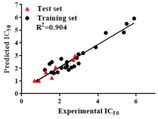 The correlation matrix between IC50 and related molecular descriptors is shown in Table 3. The descriptors of vsurf_DW23 and E_sol are significantly related to IC50, indicating that vsurf_DW23 and E_sol play an important role in the inhibitory activity of flavonoids. Also, the Pearson correlation coefficient |r| < 0.5 between each descriptor indicates that the model has not been over-fitted. The square of the correlation coefficient between the experimental and predicted IC50 values reached 0.904 (Figure 1), indicating that the experimental value is consistent with the predicted value. In addition, the model was verified by cross-validation (leave-one-out), and the cross-validation coefficient (Q2) was as high as 0.829, suggesting that the obtained model has great prediction ability. The test set prediction correlation coefficient reached 0.905, indicating that the model has better external prediction ability.