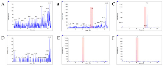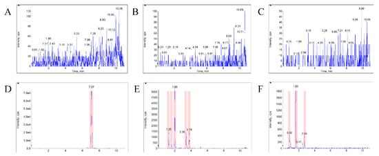 The typical MRM chromatograms of metabolites. (A), (B), and (C) represent the metabolites’ m/z 387.4–369.6, 403.25–349.22, and 419.24–365.21 in blank plasma, respectively. (D), (E), and (F) represent the three metabolites in a plasma sample from a rat with a single dose of 10 mg/kg bufalin.
