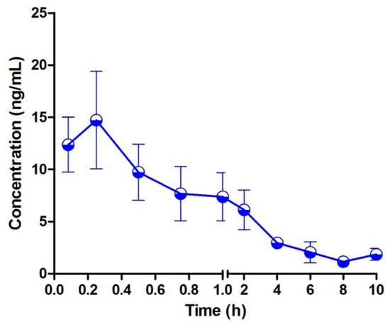 Mean plasma concentration–time profiles of bufalin in rats after oral administration of 10 mg/kg (n = 3).