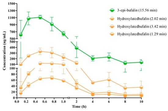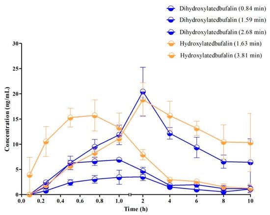 The typical MRM chromatograms of the metabolites are shown in Figure 4. These main metabolites (m/z 387.4–369.6, 403.2–349.2, 419.2–365.2) were not detected in blank blood, but could be clearly observed in plasma samples from a rat with a single dose of 10 mg/kg bufalin (Figure 4d–f). The bufalin and its nine metabolites were simultaneously determined, in order to study the pharmacokinetic behaviors of bufalin in rats after a single oral administration of 10 mg/kg. The semi-quantitation of metabolites was performed on the basis of the linear equation of bufalin. The area ratio of analyte to IS was substituted into the equation to calculate the concentration of metabolites, respectively (Tables S2 and S3). The concentration–time curves of bufalin and its main metabolites are displayed in Figure 5, Figure 6 and Figure 7, and the main pharmacokinetic parameters are exhibited in Table 6. From Figure 5 and Figure 7, it can be seen that bufalin was rapidly metabolized to 3-epi-bufalin at 5 min, and the Cmax value (963.06 ± 284.76 ng/mL) of 3-epi-bufalin was well above the bufalin (14.72 ± 4.68 ng/mL). Moreover, three hydroxylated metabolites (retention time: 2.02, 3.42, and 1.29 min) also showed higher Cmax values (299.56 ± 112.89, 107.36 ± 44.57, and 57.37 ± 13.41 ng/mL) than that of bufalin. In Figure 6, two hydroxylated metabolites and three dihydroxylated metabolites exhibited similar Cmax values with bufalin in the range of 2–25 ng/mL. These results implied that the metabolites of bufalin (isomerization and hydroxylation) may largely result in the pharmacological and toxicological effects of bufalin in rats, due to their high exposure dose in the plasma, but the toxicity and efficacy of these metabolites need to be further verified. In addition, the absorption of bufalin was quick, and reached the Cmax at 15 min. From Figure 6 and Figure 7, the results showed that the isomerization and hydroxylation mainly occurred within 30 min, and dihydroxylation occurred in the range of approximately 1–2 h. The hydroxylation and dihydroxylation mainly focused on the 1- and 5-positions [12,16], but the stereochemistry was difficult to distinguish among isomer metabolites. The main metabolites with high exposure doses should be isolated, and their active and toxic cell assays should also be performed to elucidate the pharmacological and toxicological effects of bufalin.