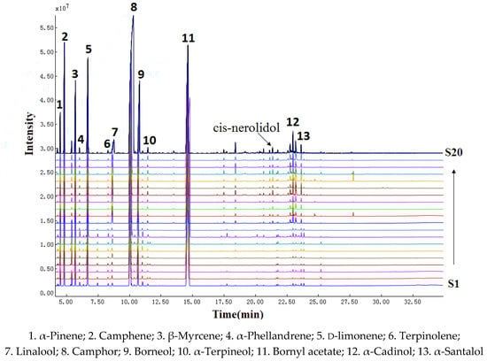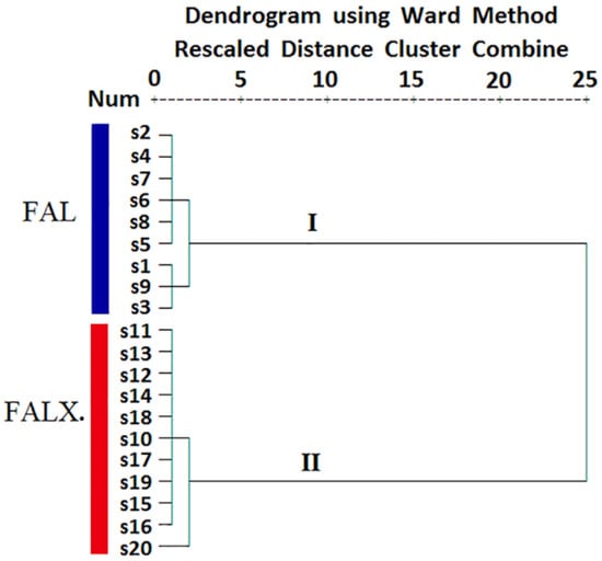 HCA is a clustering technique that measures either the difference or the similarity between the objects to be clustered. Based on the relative contents of each component in the essential oil, the samples of FA with close similarities will be crudely classified into the same cluster by HCA. All the test samples were performed using a Ward method to visualize the differences and/or similarities among samples through Euclidean distance. The results showed that the samples were clustered into two groups. The first group included S1~S9 (FAL) and the second group covered S10~S20 (FALX.). In other words, FAL and FALX. could be distinguished based on the composition of the oils. The results are shown in Figure 4.
