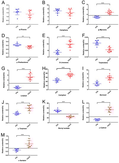 Relative contents of the common peaks in total ion chromatography (TIC) of FA from two species (A) α-pinene, (B) Camphene, (C) β-Myrcene, (D) α-Phellandrene, (E) d-Limonene, (F) Terpinolene, (G) Linalool, (H) Camphor, (I) Borneol, (J) α-Terpineol, (K) Bornyl acetate, (L) α-Cadinol and (M) α-Santalol. Data were presented as mean ± SEM. *** p < 0.001, ** p < 0.01compared with FALX. Blue dots meant the relative content of the common peaks in each FAL sample; while red dots meant those in each FALX. sample.
