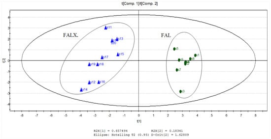 Score plot of principal component analysis of 20 samples of FA from two species.
