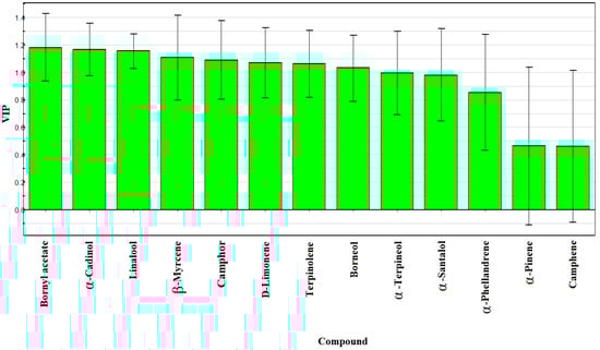 Both HCA and PCA could clearly clarify the composition of the two species, but failed to find out the variables for sample classification. Therefore, a supervised PLS-DA technique was used to visualize the variations among these samples. R2X, R2Y and Q2Y levels obtained by PLS-DA were 0.840, 0.972 and 0.962 respectively, which were suitable for fitness and prediction. Based on the PLS-DA, a loadings plot was drawn to exhibit the contribution of each variable to the discrimination of FAL and FALX. As shown in Figure 6, the 13 common peaks were listed in order according to their contribution value. Eight components with variable important plot (VIP) values greater than or equal to 1.00 were selected as the potential markers, namely bornyl acetate, α-cadinol, linalool, β-myrcene, camphor, d-limonene, terpinolene and borneol. Notably, the unpaired T-test proved that all of the selected constituents could distinguish FAL from FALX. Therefore, these markers could be used for species identification and quality control of FA. Considering that the volatile oil of FA exhibited various activities, it is worth studying whether the above compounds are responsible for these activities. The results are shown in Figure 6.