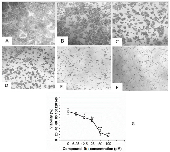Inhibition of compound 5n on cell viability in HT-29 cells by MTT staining. Cells were treated with (A) 0 μM, (B) 6.25 μM, (C) 12.5 μM, (D) 25.0 μM, (E) 50.0 μM, and (F) 100.0 μM compound 5n for 48 h. Representative images were shown; 200×. (G) Cells were treated with 6.25, 12.5, 25, 50, and 100 μM compound 5n for 48 h. Data were shown as mean ± SD. * p < 0.05, ** p < 0.01 and *** p < 0.001 compared with group 0 μM.