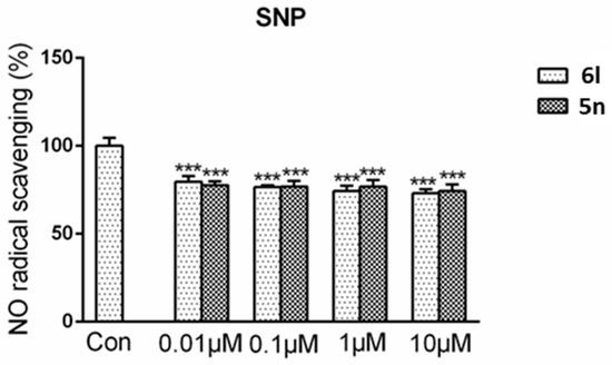 Compound 6l and 5n had NO radical scavenging activity. 6l (0.01 μM, 0.1 μM, 1 μM, and 10 μM) or 5n (0.01 μM, 0.1 μM, 1 μM, and 10 μM) was added to a concentration of 0.5 mM SNP solution. After reacted for 1 h under normal sun light at room temperature, Griess reagent was added and the optical density was observed at 540 nm. Data were shown as mean ± SD. *** p < 0.001 compared with control group.