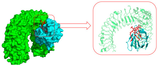 The surface representation of LPS (red) and Toll-like receptor 4 (TLR4) (green)/MD-2 (cyan) binding pocket (PDB: 3VQ2).