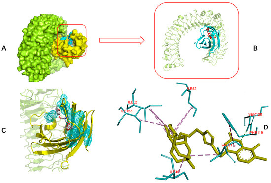 Interaction diagrams of the selected docked conformations of compound 5n to TLR4/MD-2 complex. (A) The surface representation of compound 5n and TLR4 (limon)/MD-2 (yellow) binding pocket. (B) The magnified representation of compound 5n (red) and TLR4 (limon)/MD-2 (cyan) binding pocket. (C) The interface of compound 5n and TLR4/MD-2 complex; (D) 3D ligand interactions diagram. Dotted line; pink: alkyl hydrophobic; blue: pi hydrophobic; green: hydrogen bond.