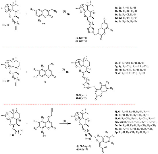 The synthesis of the intermediates a–p and I–IV is presented in Scheme 1. The intermediates I and II were obtained by 2-bromoethanol or 3-bromo-1-propanol, with dihydroartemisinin (DHA), respectively, followed by treating the product with sodium azide. The intermediates III and IV were synthesized by propargyl alcohol or 3-butyn-1-ol with DHA, respectively. The required 3-methylcoumarin derivatives were obtained by substitution of salicylaldehyde with propionic anhydride in the presence of sodium propionate and triethylamine. The substituted-3-bromomethylcoumarins were prepared by the radical bromination of 3-methylcoumarin derivatives through the reaction with N-Bromosuccinimide (NBS) in the presence of dibenzoylperoxide [36]. The intermediates a–e were synthesized by substituted-3-bromomethylcoumarins via azidation reaction. The required substituted-4-chloromethylcoumarins were prepared by the Pechmann cyclisation [37] of substituted phenols with 4-chloroethylacetoacetate using sulfuric acid as the condensing agent. The intermediates f–i were synthesized by substituted-4-chloromethylcoumarin via azidation reaction. To synthesize the intermediates j–p, several substituted-4-hydroxycoumarin were prepared by condensing the substituted phenol with malonic acid [38]. Then the products were treated with 3-bromo-1-propyne in the presence of potassium carbonate.
