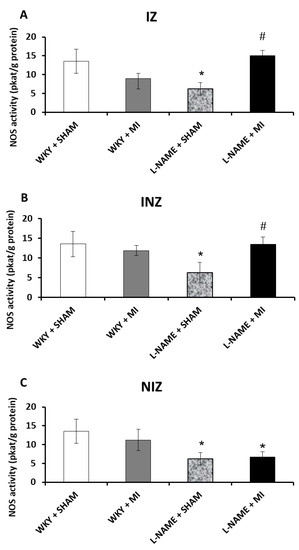 The effect of myocardial infarction on nitric oxide synthase (NOS) activity of infarcted zone (A), injured zone (B) and non-infarcted zone (C) of myocardium. Total NOS activity levels of sham operated Wistar Kyoto rats (WKY + Sham); WKY rats with experimentally induced myocardial infarction (WKY + MI); sham operated WKY rats treated with L-NAME (20 mg/kg/day) (L-NAME + Sham) and L-NAME (20 mg/kg/day) treated WKY rats with experimentally induced myocardial infarction (L-NAME + MI) in infarcted zone (IZ) (A), injured zone (INZ) (B) and non-infarcted zone (NIZ) (C). * p < 0.05 compared to WKY + Sham; # p < 0.05 compared to L-NAME + Sham group; N = 6 in each group.