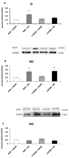 The effect of myocardial infarction on endothelial NOS (eNOS) expression of infarcted zone (A), injured zone (B) and non-infarcted zone (C) of myocardium. Representative western blot images and relative eNOS expression levels of sham operated Wistar Kyoto rats (WKY + Sham); WKY rats with experimentally induced myocardial infarction (WKY + MI); sham operated WKY rats treated with L-NAME (20 mg/kg/day) (L-NAME + Sham) and L-NAME (20 mg/kg/day) treated WKY rats with experimentally induced myocardial infarction (L-NAME + MI) in infarcted zone (IZ) (A), injured zone (INZ) (B) and non-infarcted zone (NIZ) (C). * p < 0.05 compared to WKY + Sham group; N = 6 in each group.