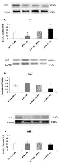 Western blot analysis was used to determine protein expression levels within each of the four groups. Endothelial NOS protein expression was upregulated in IZ and INZ of WKY + MI group (p < 0.05; Figure 2A) as well as in INZ of L-NAME + MI group (p < 0.05; Figure 2B). The L-NAME only administration did not change eNOS expression in any zone of myocardium in comparison to the controls (Figure 2A–C). iNOS was downregulated in the infarcted zone in WKY + MI group (p < 0.05; Figure 3A) and the injured zone in L-NAME + MI group (Figure 3B). There were no differences in iNOS expression in NIZ of normotensive and hypertensive rats (Figure 3C).