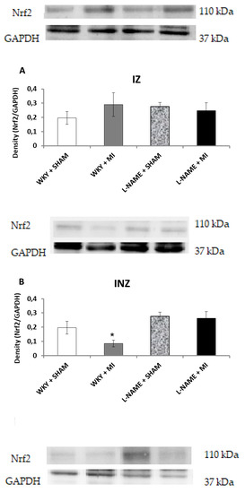 The effect of myocardial infarction on Nrf2 expression of infarcted zone (A), injured zone (B) and non-infarcted zone (C) of myocardium. Representative western blot images and relative Nrf2 expression levels of sham operated Wistar Kyoto rats (WKY + Sham); WKY rats with experimentally induced myocardial infarction (WKY + MI); sham operated WKY rats treated with L-NAME (20 mg/kg/day) (L-NAME + Sham) and L-NAME (20 mg/kg/day) treated WKY rats with experimentally induced myocardial infarction (L-NAME + MI) in infarcted zone (IZ) (A), injured zone (INZ) (B) and non-infarcted zone (NIZ) (C). * p < 0.05 compared to WKY + Sham group; N = 6 in each group.