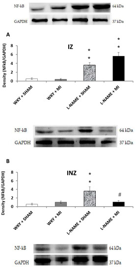 Interestingly, Nrf2 protein expression levels within the INZ were significantly decreased (p < 0.05) in WKY + IM when compared to WKY + Sham animals (Figure 4B). Other values did not differ (Figure 4A,B,C). The present study further assessed the effect of inflammation after MI by determining NFҡB/p65 protein expression levels. NFҡB/p65 is upregulated in the IZ of both hypertensive groups, and significantly higher in L-NAME + MI group (p < 0.01; Figure 5A). Surprisingly, we observed a significant increase in NFҡB/p65 within the INZ and NIZ of L-NAME + sham rats (p < 0.01), however, it was downregulated in the INZ in L-NAME + MI animals (p < 0.01, Figure 5B,C).