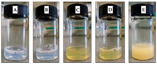 Visual appearance of the nanomicelles. (A) Empty polymeric nanomicelles (PNM); (B) Empty mixed nanomicelles (MNM); (C) Silymarin (SLM)-loaded PNM; (D) SLM-loaded MNM; (E) SLM aqueous suspension.