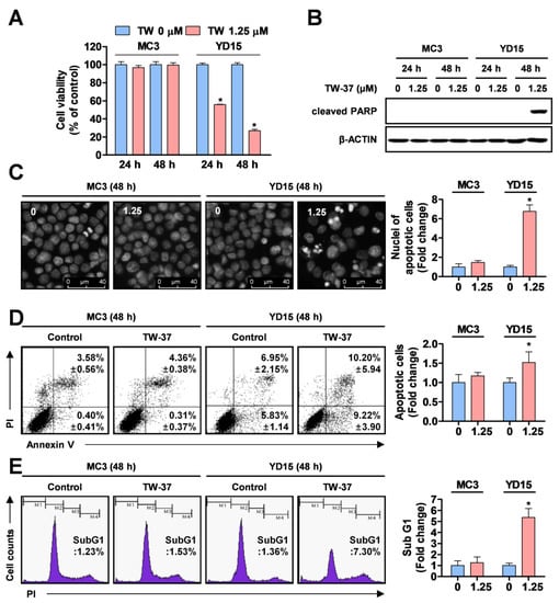 To investigate the anti-proliferative effects of TW-37 in two human MEC cell lines (MC3 and YD-15) in vitro, both cell lines were treated with vehicle control (DMSO) or 1.25 μM TW-37 for the indicated time points. TW-37 resulted in significant decreases in cell viability in YD-15 cells (Figure 1A). The IC50 values for inhibition of cell viability at 24 and 48 h were 1.41 and 0.85 μM, respectively. In contrast, no growth inhibitory effects of TW-37 at the same concentration were observed in MC3 cells. To determine whether the anti-proliferative effects of TW-37 were related to the induction of an apoptotic response, we examined levels of PARP cleavage, a hallmark of apoptosis. Treatment of TW-37 for 48 h clearly induced the cleavage of PARP in YD-15 cells but not in MC3 cells (Figure 1B). Although 24 h treatment of TW-37 in YD15 cells decreased cell viability, it induced s-phase cell cycle arrest instead of an increase in the cleavage of PARP (Figure S1). Consistent with these observations, fluorescence-based results from DAPI staining showed that TW-37 led to obvious induction of nuclear condensation and DNA fragmentation, typical features of apoptosis (Figure 1C). Then, we confirmed TW-37-induced apoptosis by assessing flow cytometry experiments. The rate of annexin V-positive cells in YD-15 cells was increased from 12.78% of the control group to 19.42% of the TW-37 treatment group (Figure 1D). The proportion of sub-G1 phase YD-15 cells in the TW-37 treatment group was 7.30%, compared with 1.36% of control group (Figure 1E). However, no significant changes in induction of apoptosis were observed in MC3 cells. These results indicate that YD-15 cells were sensitive to inhibition of cell growth and induction of apoptosis under TW-37 treatment, unlike MC3 cells.