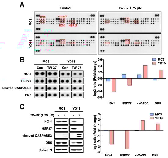 To identify the causes of differential response to TW-37 between MC3 and YD-15 cells, we evaluated the relative expression levels of 35 apoptosis-related proteins using a human apoptosis array. Four proteins (HO-1, HSP27, cleaved caspase 3, and DR5) were changed by TW-37 treatment in YD-15 cells compared with in MC3 cells (Figure 2A,B). To verify results from the human apoptosis array, the levels of four proteins were detected by western blotting. TW-37 resulted in pronounced reductions of anti-apoptotic proteins (HO-1 and HSP27), whereas the levels of pro-apoptotic proteins (cleaved caspase 3 and DR5) were increased in YD-15 cells (Figure 2C). However, no significant differences in protein levels were observed in MC3 cells. These results indicate that these four proteins affect the response of two human MEC cell lines to TW-37.